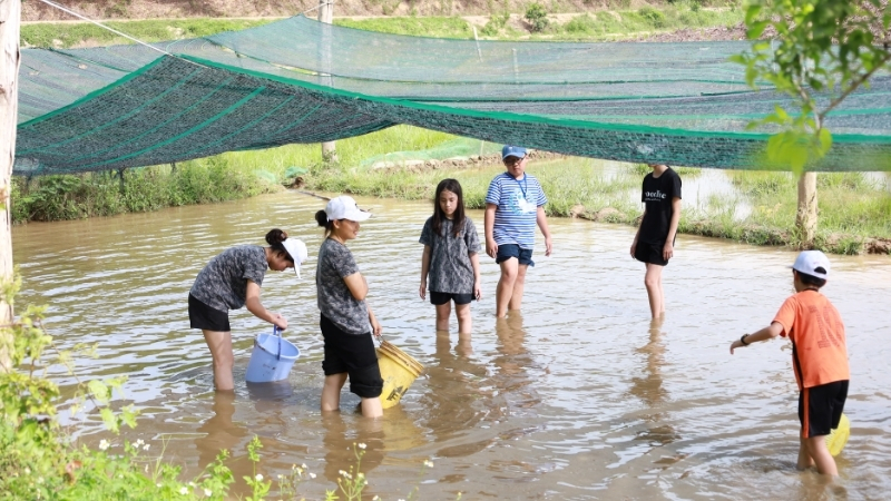 Trải nghiệm làm nông dân: trồng cây, chăm sóc vườn rau, bắt cá, thu hoạch nông sản.